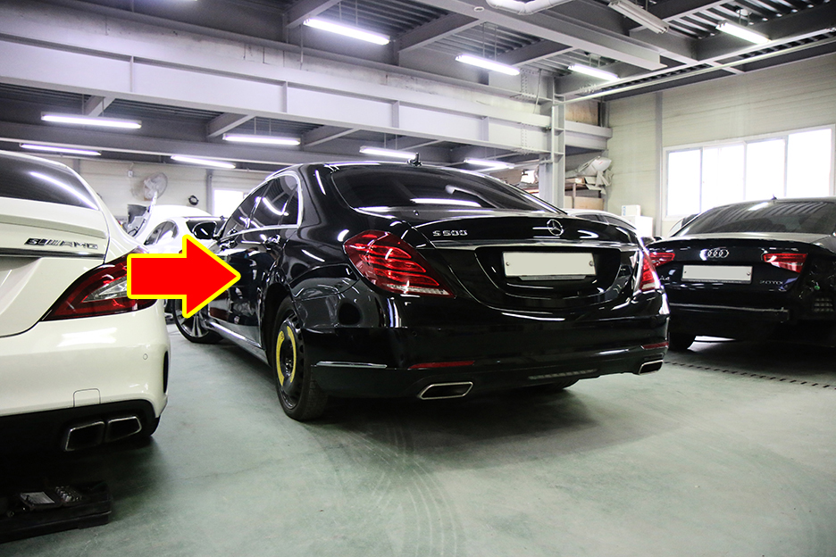 사진 속 S500 차량은 운전석 뒤 도어 및 뒤 휀더, 사이드스컷 그리고 휠까지 여러 군데 손상을 입었습니다.